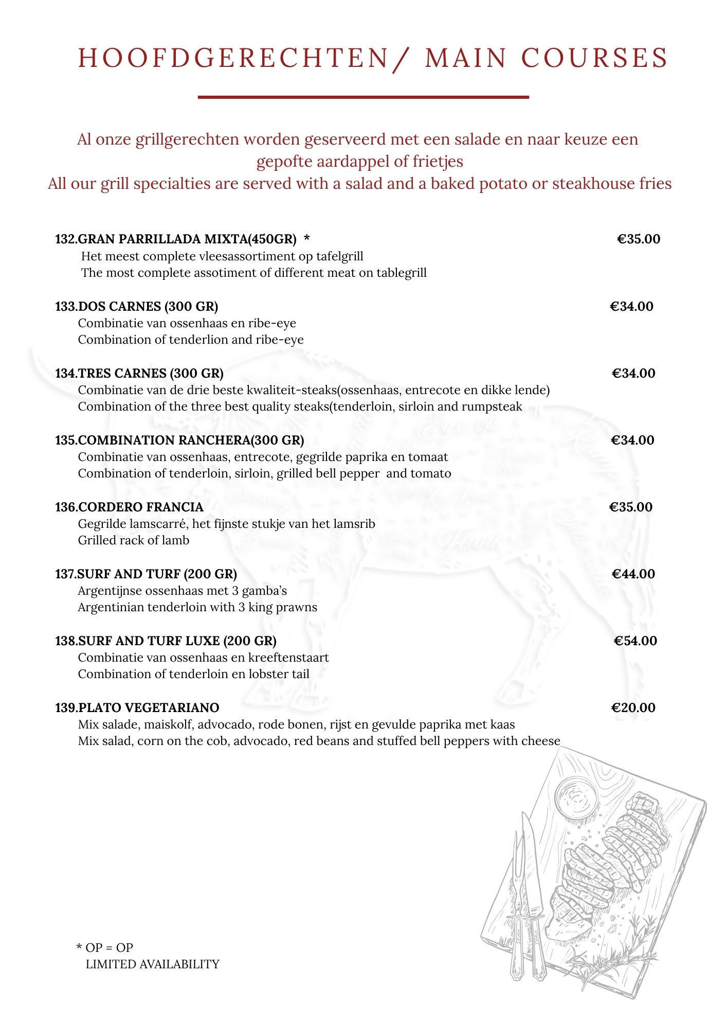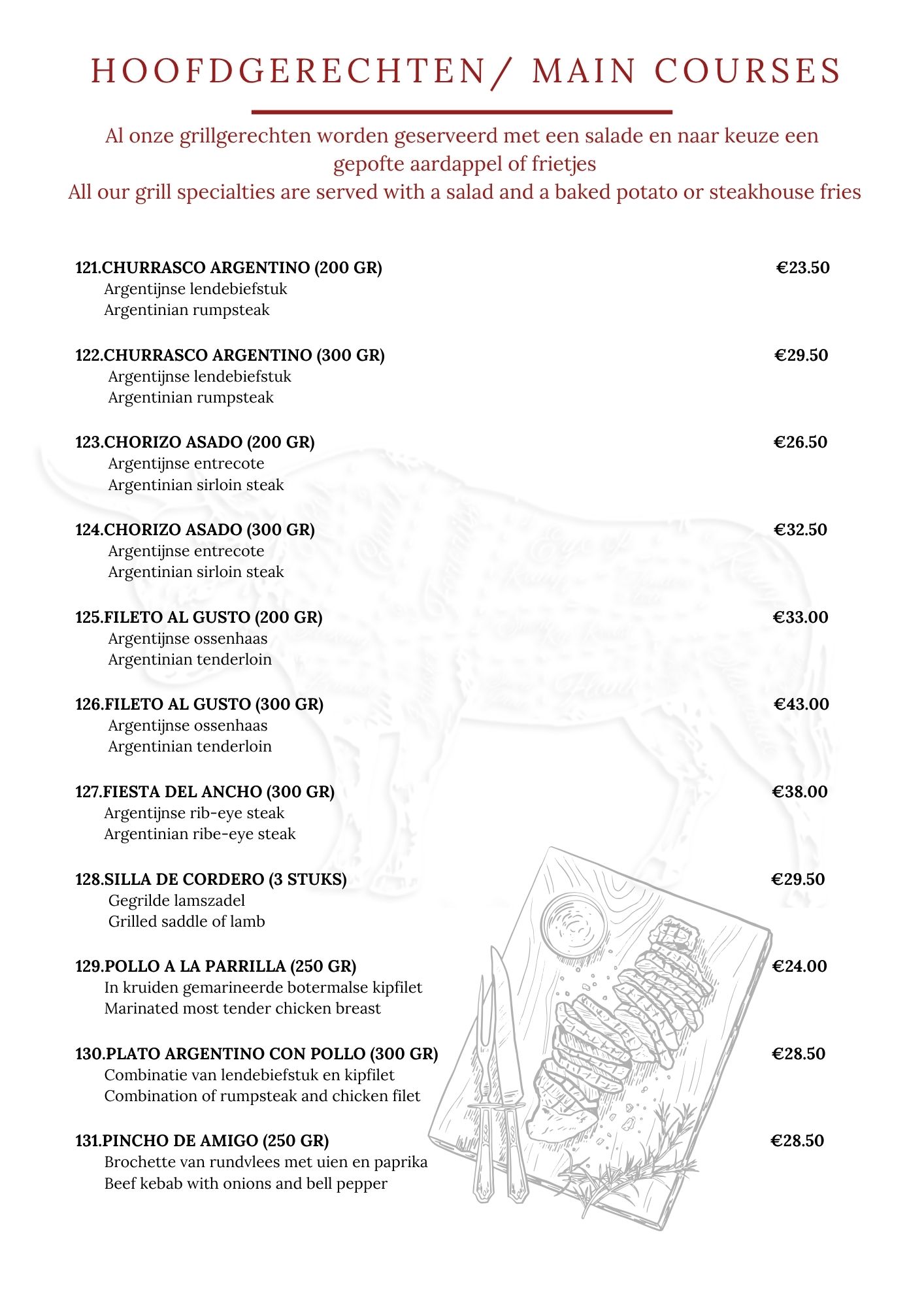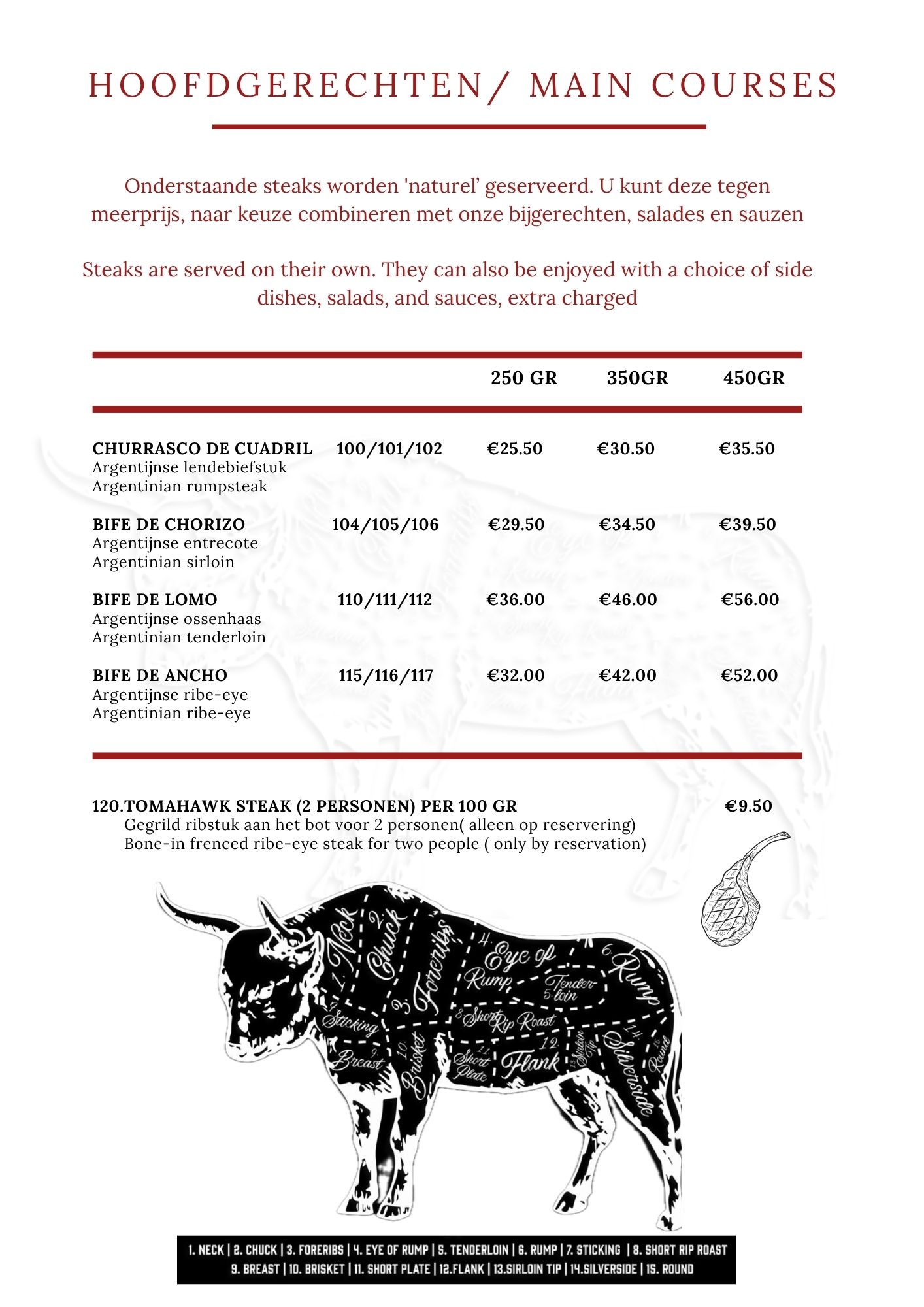 Ons menu In het restaurant wordt het vlees boven een houtskool grill bereid, waardoor het vlees een bijzondere smaak krijgt.