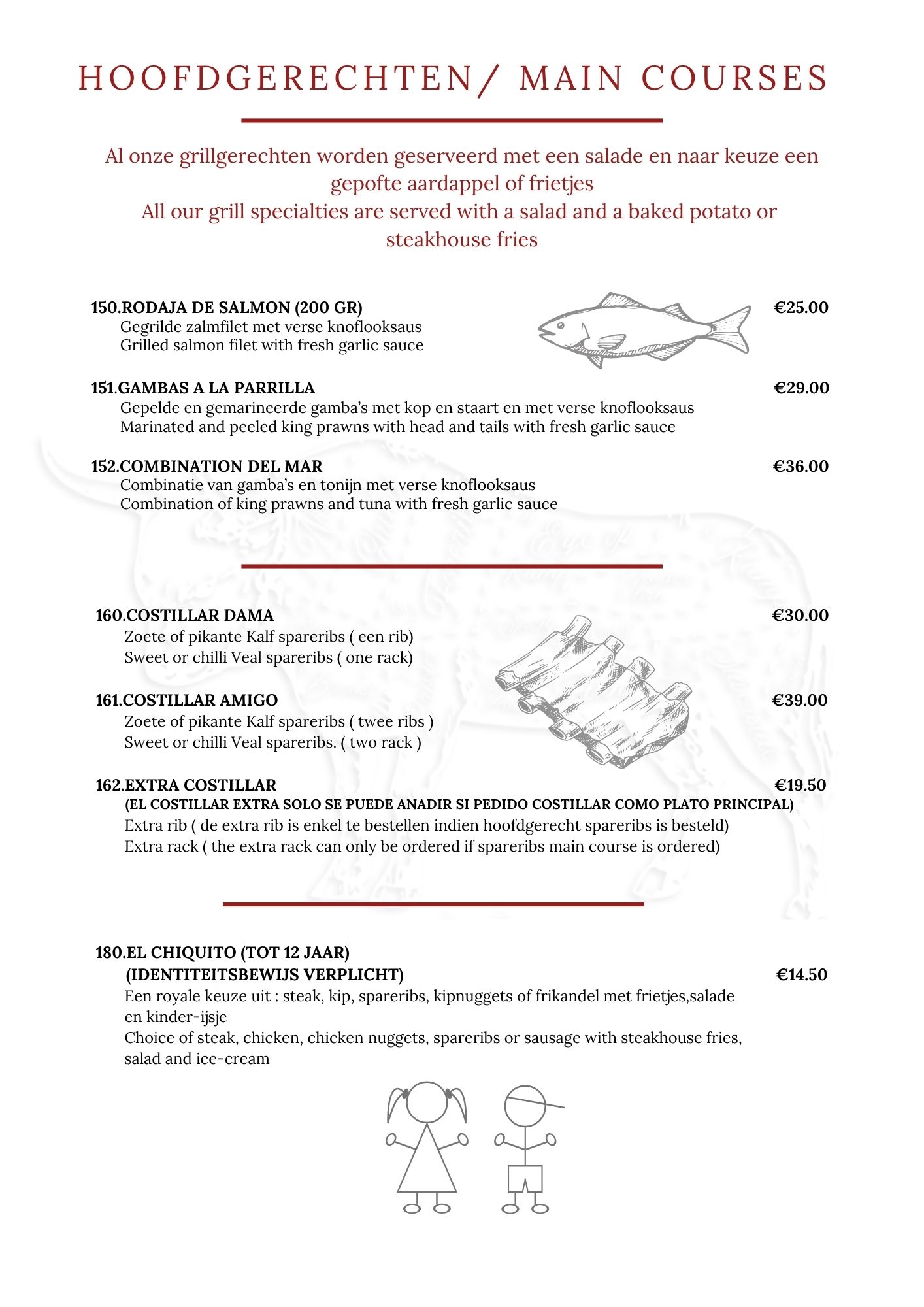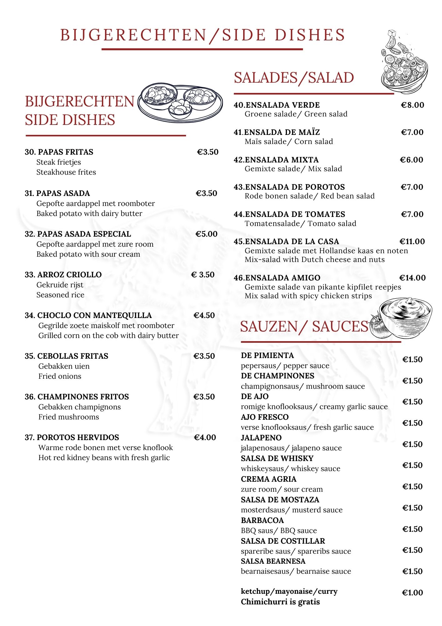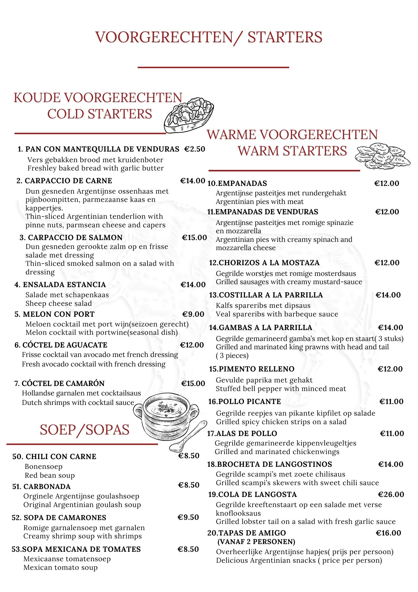 Ons menu In het restaurant wordt het vlees boven een houtskool grill bereid, waardoor het vlees een bijzondere smaak krijgt.